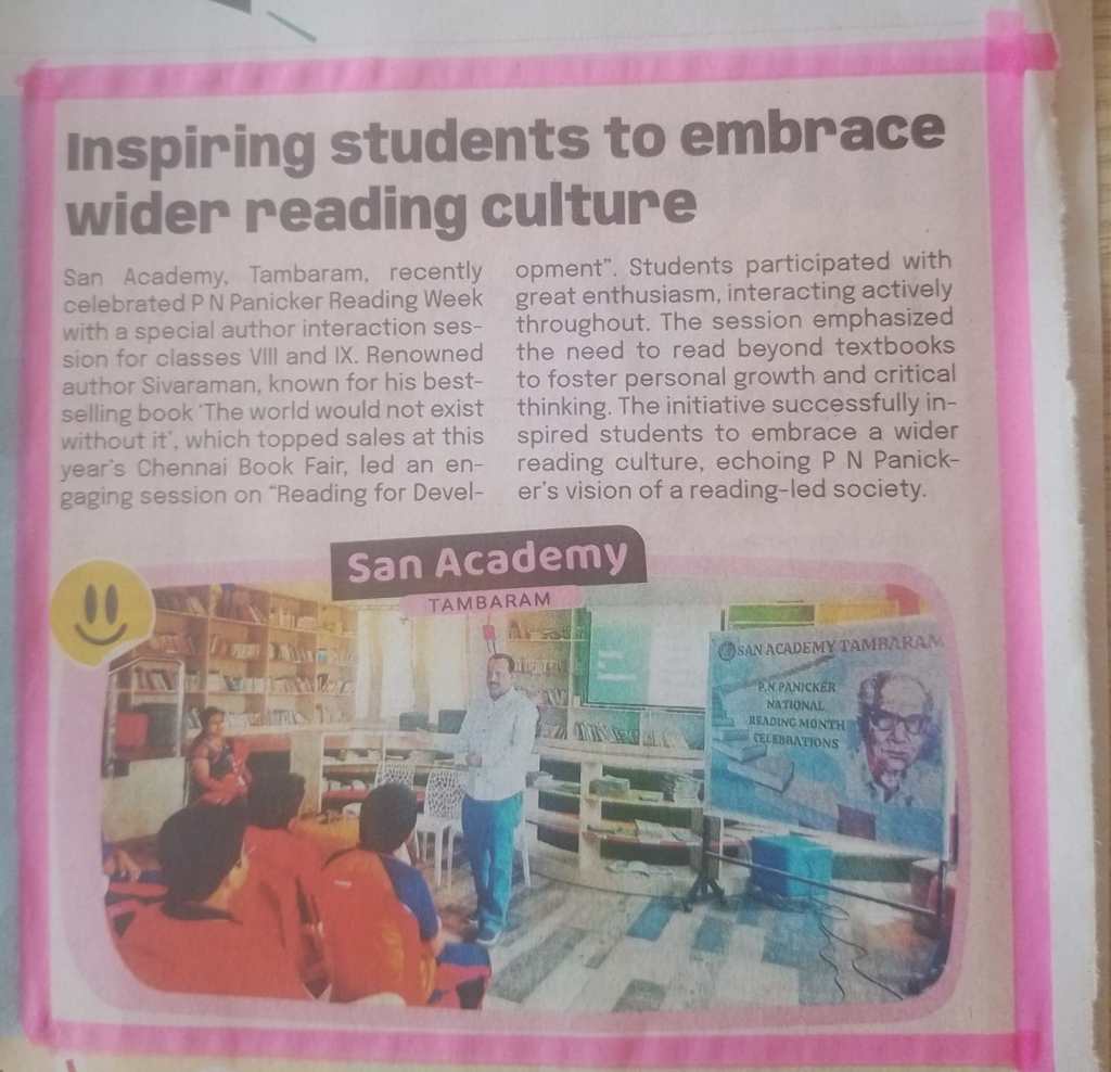இன்று தாம்பரம் சான் அகாடமி பள்ளியில் reading for development என்னும் தலைப்பில் ஓர் உரையாற்ற அழைத்திருந்தார்கள். பாடப் புத்தகங்கள் தாண்டி, மாணவர்களுக்கு வாசிப்பு ஆர்வத்தைத் தூண்டுவது, அதன் தேவையை அவர்களுக்குப் புரியவைப்பது, அதனால் ஏற்படும் நீண்ட காலப்பயன்கள் பற்றி விளக்கமாகச் சொல்வது என்பது ஏற்பாடு.