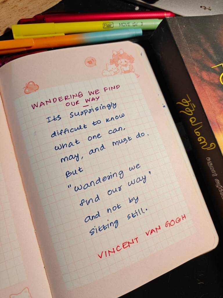வான்கா தன் சகோதரனுக்கு எழுதிய கடிதத்தின் ஒரு பகுதியைத்தான் இன்றைய ஜர்னலாக எழுதியிருக்கிறேன். நேற்றுதான் இதைப் படித்தேன். இது என்னை வந்து சேர்ந்தபோது, சட்டென விழித்து, எழுந்து, ஓடி, அலைந்து என் சிற்றழுத்தத்திலிருந்து மீண்டு வந்தேன். yes, wandering we find our way.